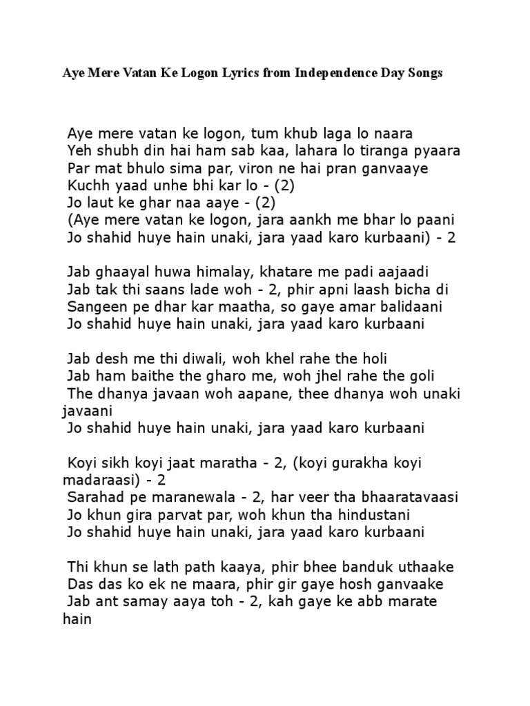 Aye Mere Watan Ke Logo Lyrics In Hindi : Chant slogans in praise of our country.